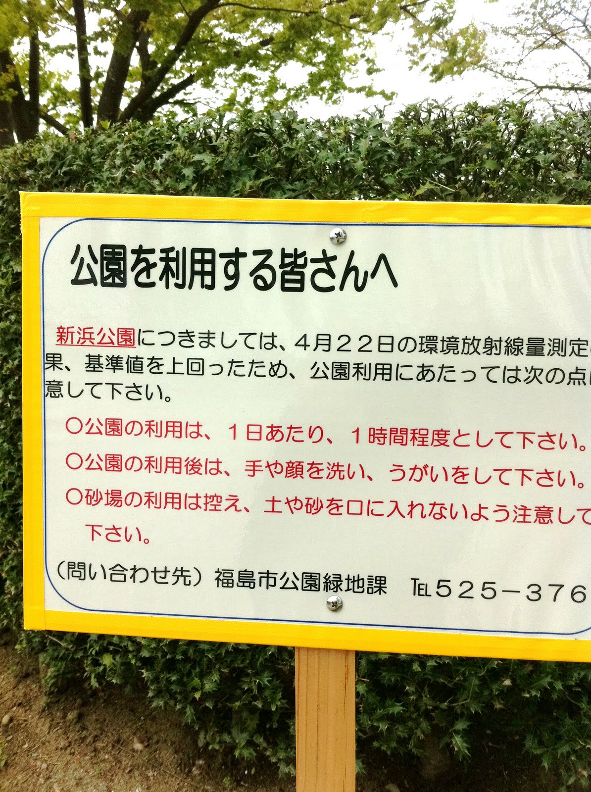 福島市の新浜公園では、放射線量が高いためにこのような看板が立っていました。